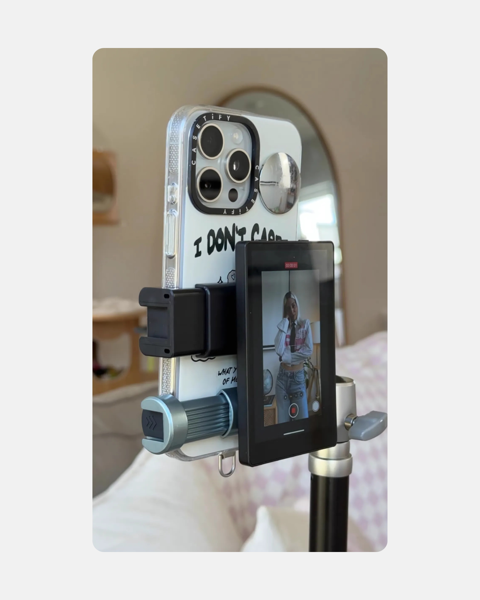 Take your content creation to the next level with the Magnetic Phone Monitor Mount, the perfect tool for vloggers, streamers, and social media creators. Designed to work seamlessly with your iPhone’s high-resolution rear camera, this innovative clip-on monitor screen lets you see yourself while filming—ensuring every shot is sharp, clear, and perfectly framed.